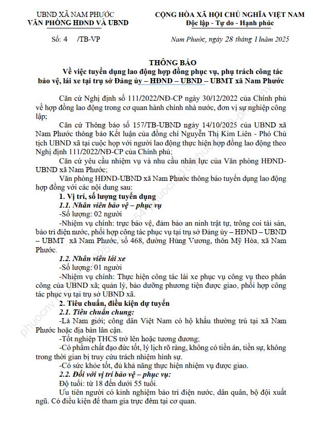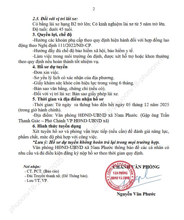 bảo vệ, lái xe tại trụ sở Đảng ủy – HĐND – UBND – UBMT xã Nam Phước