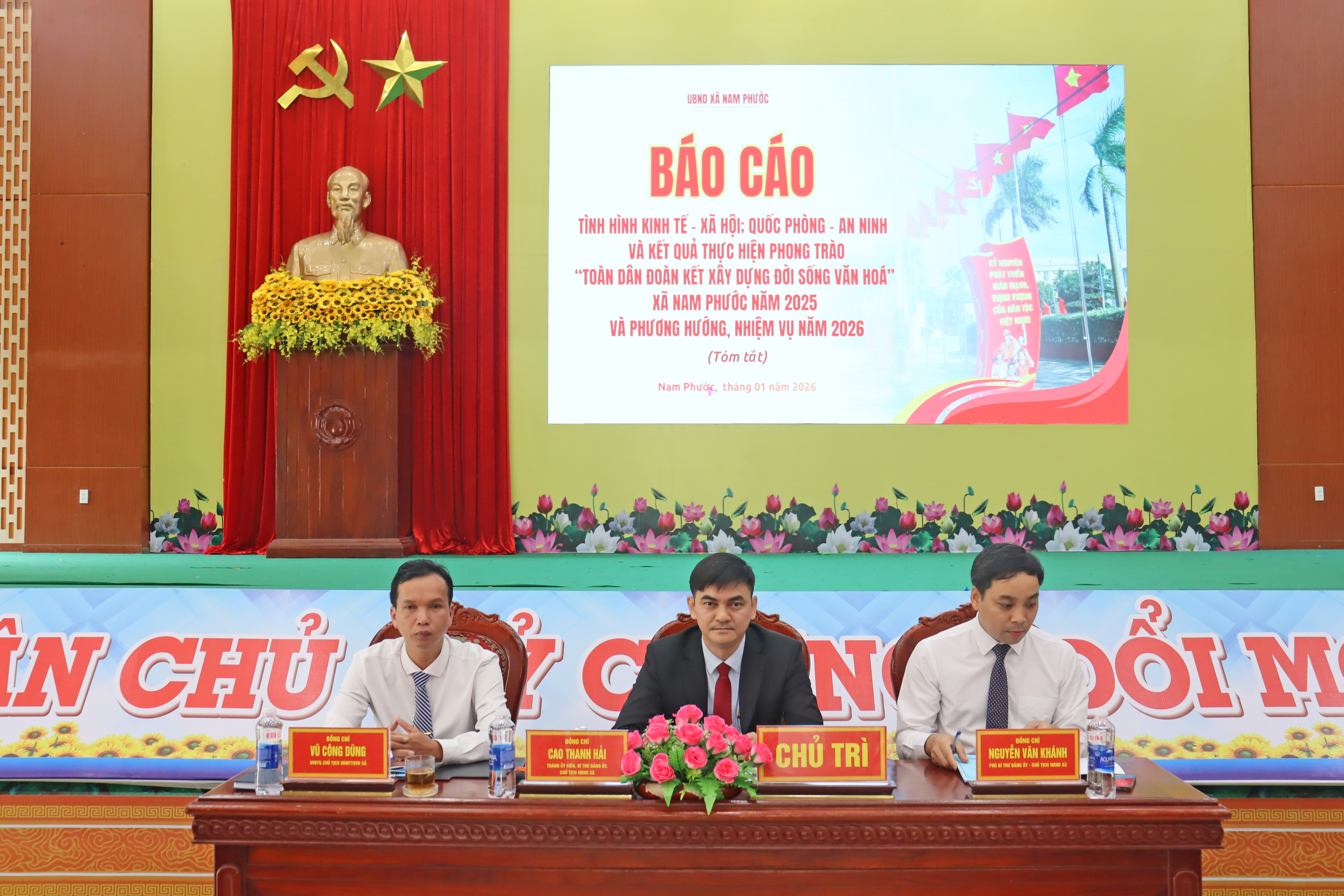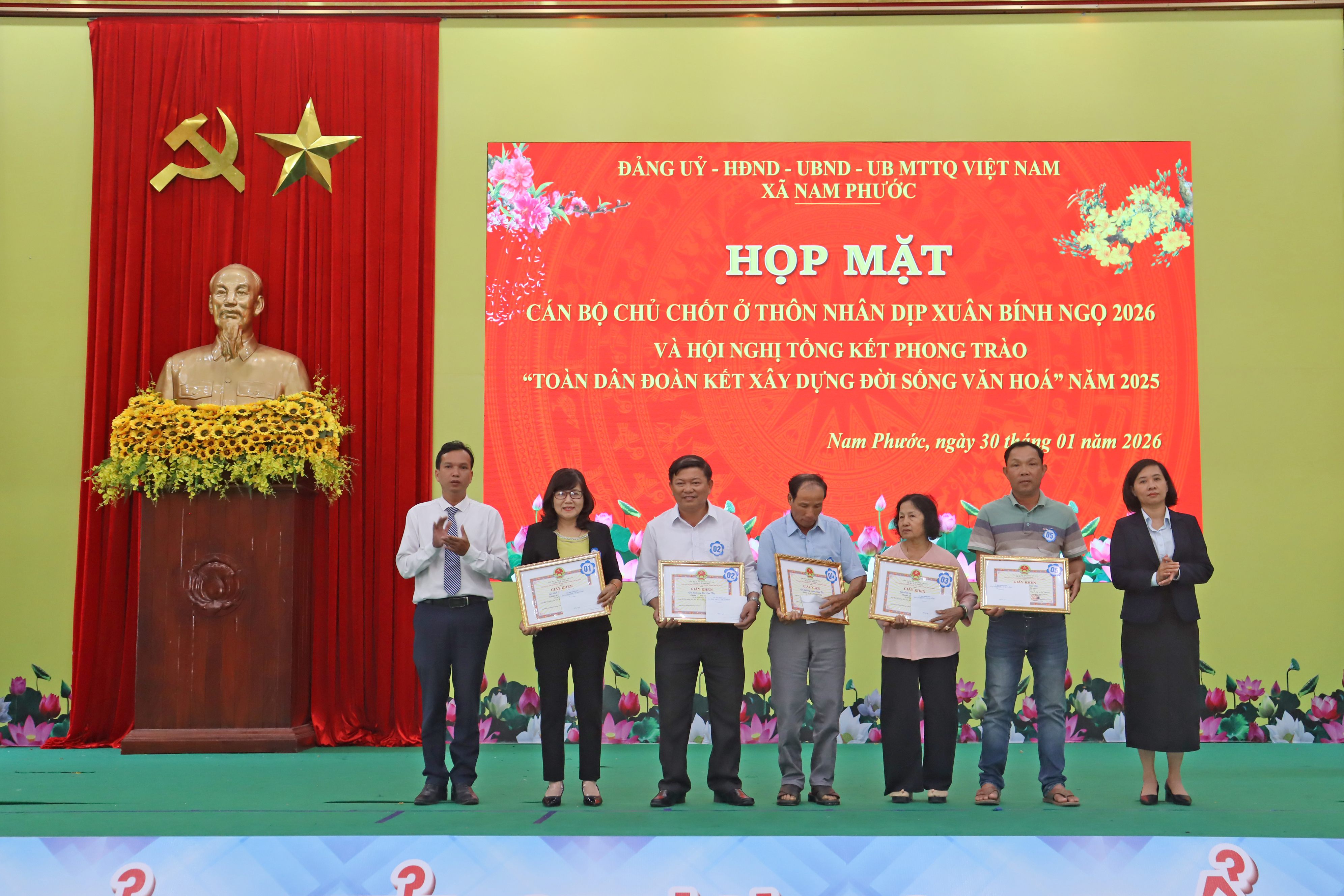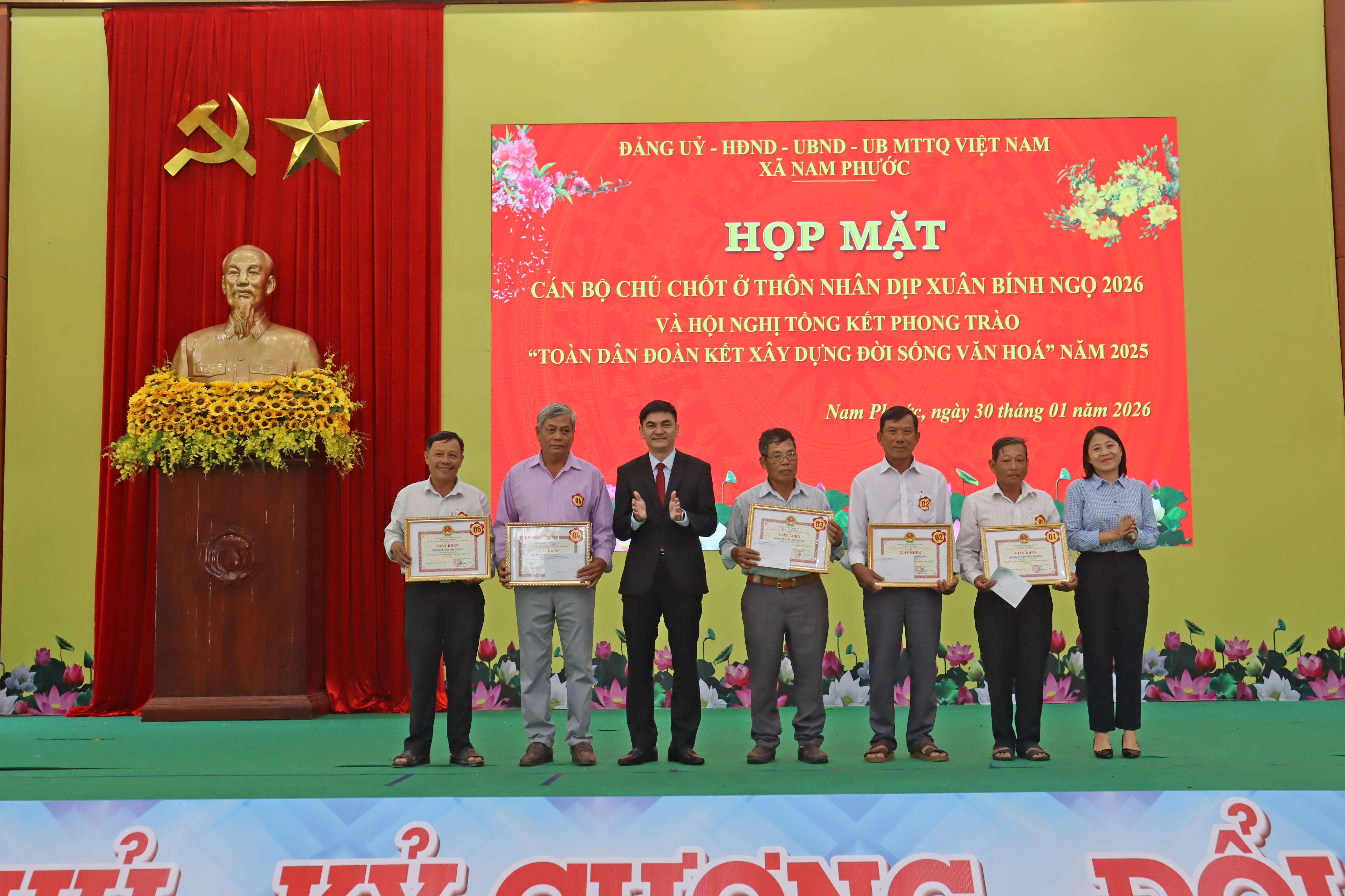 Ngày 30/01, Đảng ủy, Hội đồng Nhân dân, Ủy ban nhân dân, ủy ban MTTQ Việt Nam xã Nam Phước tổ chức chương trình họp mặt cán bộ thôn và hội nghị tổng kết phong trao toàn dân đoàn kết năm 2025. Chương trình do đồng chí Cao Thanh Hải – Thành ủy viên, Bí thư Đảng ủy, Chủ tịch HDND xã, đồng chí Nguyễn Văn Khánh – Phó bí thư, Chủ tịch UBND xã, đồng chí Vũ Công Dũng, Ủy viên ban thường vụ, Chủ tịch Ủy ban MTTQ Việt Nam xã Nam Phước Chủ trì.
