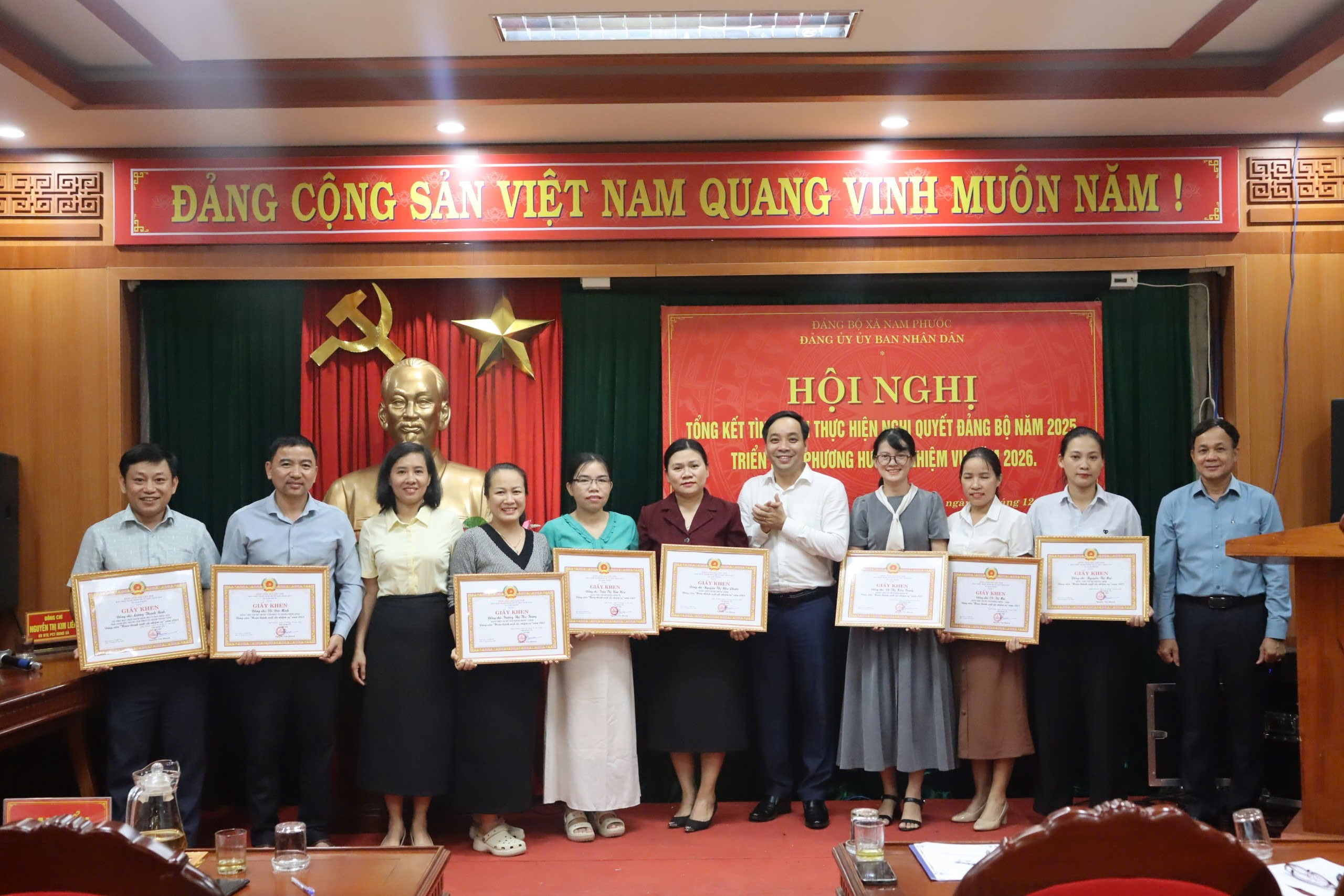 Tại hội nghị Đảng uỷ Ủy ban nhân dân xã Nam Phước đã trao giấy khen cho 1 tổ chức Đảng hoàn thành xuất sắc nhiệm vụ và 9 Đảng viên hoàn thành xuất sắc nhiệm vụ trong năm 2025.
